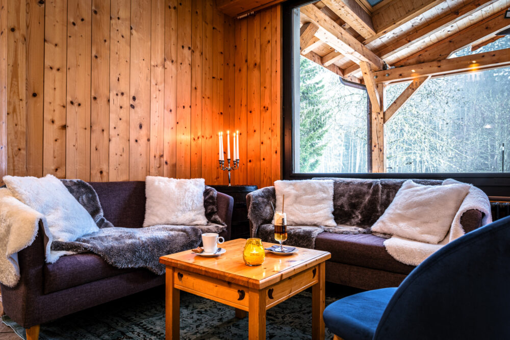 In the heart of Chamonix, nestled in a pine forest, on the cross-country ski trails and hiking and mountain biking trails facing the imposing Mont Blanc massif.