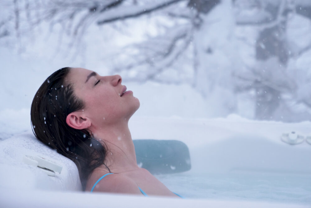 A beautiful woman in the whirlpool relaxes, breathes clean air, and is happy in the middle of nature as the snow falls from the sky. Concept of: relaxation, nature, wellness.